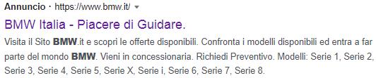 Cercando BMW su Google infatti appare questo annuncio e anch’esso fa leva sulla promessa del brand che giustamente viene martellata costantemente.